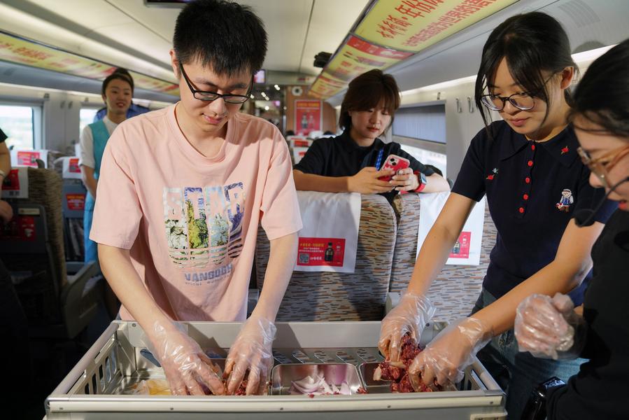 HARBIN, June 19 (Xinhua) -- A Qiqihar barbecue cultural experience event was held Wednesday on bullet train D6993 running from Harbin West Railway Station to Qiqihar South Railway Station in northeast China's Heilongjiang Province, offering a "palatable" travel experience to passengers during the journey.