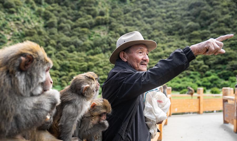 Tobgye is surrounded by Tibetan macaques at Linze ecological and cultural scenic area in Linze Village of Gongbo'Gyamda County, Nyingchi City, southwest China's Xizang Autonomous Region, on July 23, 2025. (Xinhua/Tenzin Nyida)Tibetan macaques are pictured at Linze ecological and cultural scenic area in Linze Village of Gongbo'Gyamda County, Nyingchi City, southwest China's Xizang Autonomous Region, on July 23, 2025. (Xinhua/Tenzin Nyida)Tibetan macaques are pictured at Linze ecological and cultural scenic area in Linze Village of Gongbo'Gyamda County, Nyingchi City, southwest China's Xizang Autonomous Region, on July 23, 2025. (Xinhua/Tenzin Nyida)Tobgye is surrounded by Tibetan macaques at Linze ecological and cultural scenic area in Linze Village of Gongbo'Gyamda County, Nyingchi City, southwest China's Xizang Autonomous Region, on July 23, 2025. (Xinhua/Tenzin Nyida)Tobgye patrols on a boardwalk of Linze ecological and cultural scenic area in Linze Village of Gongbo'Gyamda County, Nyingchi City, southwest China's Xizang Autonomous Region, on July 23, 2025. (Xinhua/Tenzin Nyida)Tobgye feeds peanuts to Tibetan macaques at Linze ecological and cultural scenic area in Linze Village of Gongbo'Gyamda County, Nyingchi City, southwest China's Xizang Autonomous Region, on July 23, 2025. (Xinhua/Tenzin Nyida)Tobgye take photos of Tibetan macaques at Linze ecological and cultural scenic area in Linze Village of Gongbo'Gyamda County, Nyingchi City, southwest China's Xizang Autonomous Region, on July 23, 2025. (Xinhua/Tenzin Nyida)Tobgye feeds peanuts to Tibetan macaques at Linze ecological and cultural scenic area in Linze Village of Gongbo'Gyamda County, Nyingchi City, southwest China's Xizang Autonomous Region, on July 23, 2025. (Xinhua/Tenzin Nyida)Tobgye observes Tibetan macaques on a tree at Linze ecological and cultural scenic area in Linze Village of Gongbo'Gyamda County, Nyingchi City, southwest China's Xizang Autonomous Region, on July 23, 2025. (Xinhua/Tenzin Nyida)