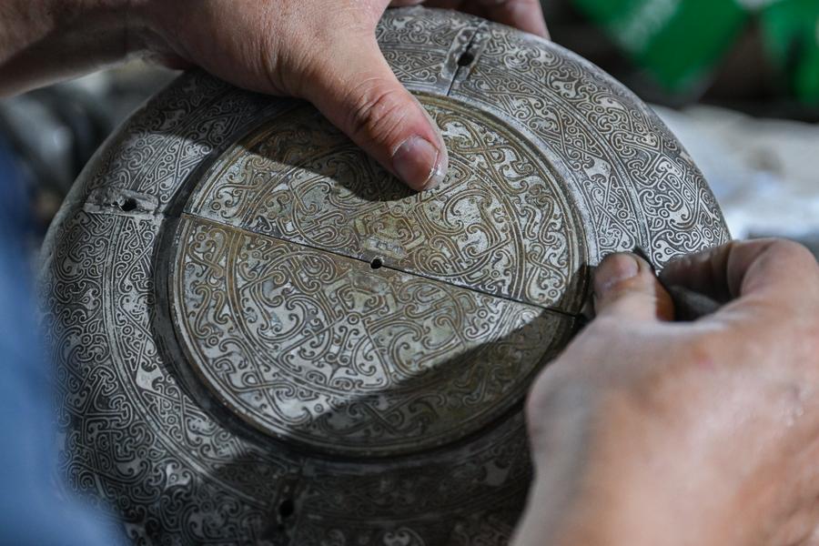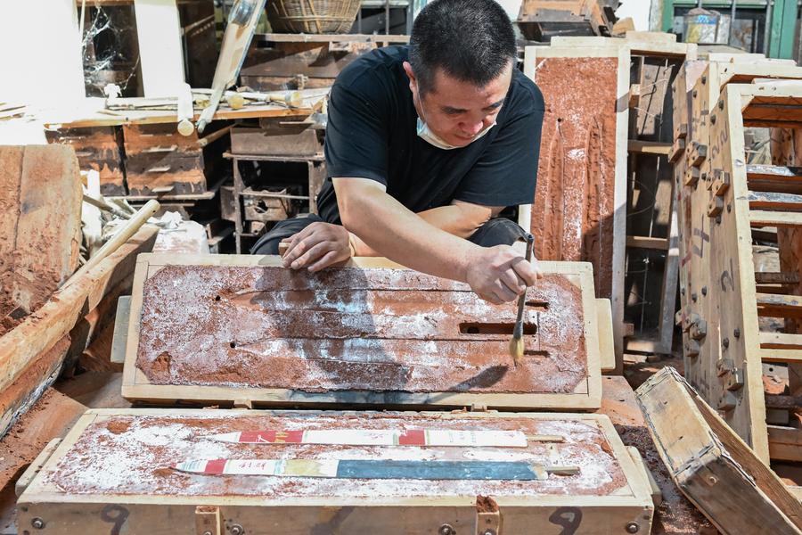 JINGZHOU, Aug. 30 (Xinhua) -- Lead-Tin Engraving, a mould-making craft used to create and replicate bronze ware, is known for its excellent work in reproducing the fine and exquisite patterns on ancient bronze ware. Mixing tin into lead to get a softer texture for making a mould, the craft can create both 2D and 3D patterns. The making of a bronze ware roughly goes through procedures like pattern designing, mud mould making, lead-tin mould making, engraving, molten copper pouring and grinding. In 2001, the craft of Lead-Tin Engraving was listed as one of the national-level intangible cultural heritages.