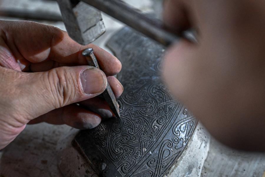 Lead-Tin Engraving craft has been passed down for five generations in Ao's Family in Jingzhou of central China's Hubei Province. Ao Xinghua, 52 years old, a fourth-generation inheritor, has been doing the work for over 30 years. Since childhood, he had followed his father Ao Chaozong, a national-level inheritor of the art who had mastered all the procedures of making a bronze ware, to get in touch with the craft. "My grandfather and father regarded the art as their lives, and had devoted all they have into it," said Ao Xinghua.