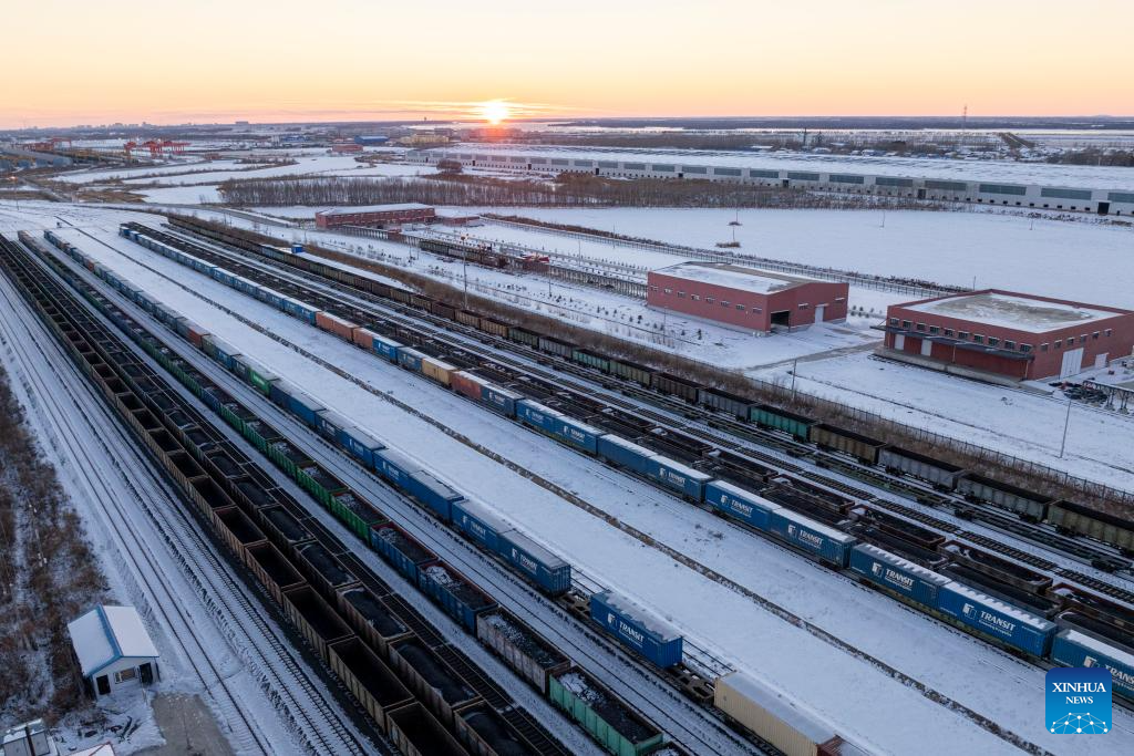 This aerial drone photo taken on Nov. 15, 2025 shows the transshipment yard at Tongjiang North Railway Station in Tongjiang City, northeast China's Heilongjiang Province. As an important part of the eastern corridor of the China-Europe freight train service, Tongjiang Railway Port has handled a total of 273 China-Europe freight train trips since it was launched in 2022, with over 14 million tonnes of imported and exported goods, according to data from China Railway Harbin Group Co., Ltd. (Photo by Wu Yunan/Xinhua)