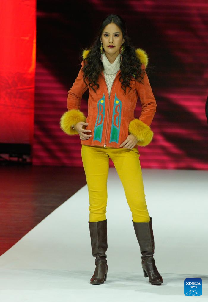 A model presents a creation during the runway show at Vancouver Indigenous Fashion Week 2025 in Vancouver, British Columbia, Canada, Nov. 19, 2025. (Photo by Liang Sen/Xinhua)