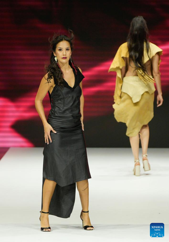Models present creations during the runway show at Vancouver Indigenous Fashion Week 2025 in Vancouver, British Columbia, Canada, Nov. 19, 2025. (Photo by Liang Sen/Xinhua)