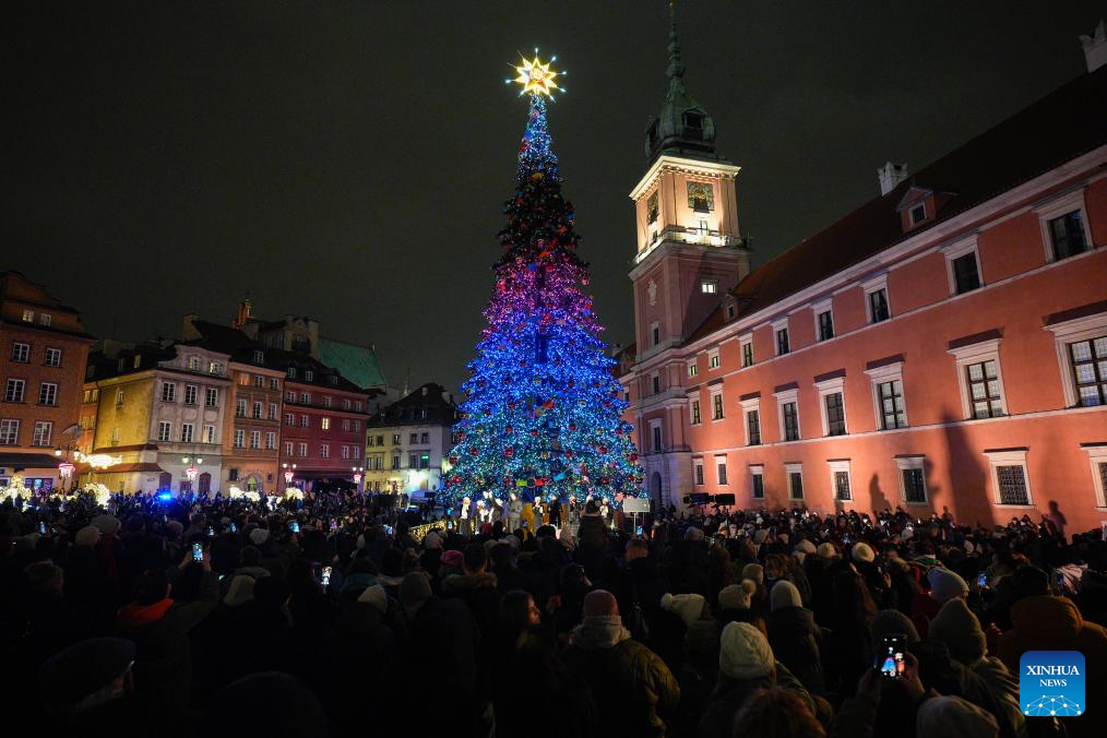A Christmas tree is lighted on Castle Square, in Warsaw, Poland, Dec. 3, 2025. Christmas decorations bring strong festive vibe to the city. (Photo by Jaap Arriens/Xinhua)