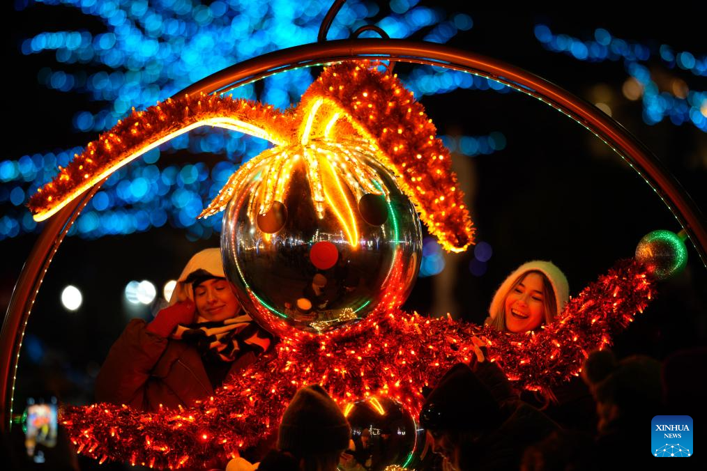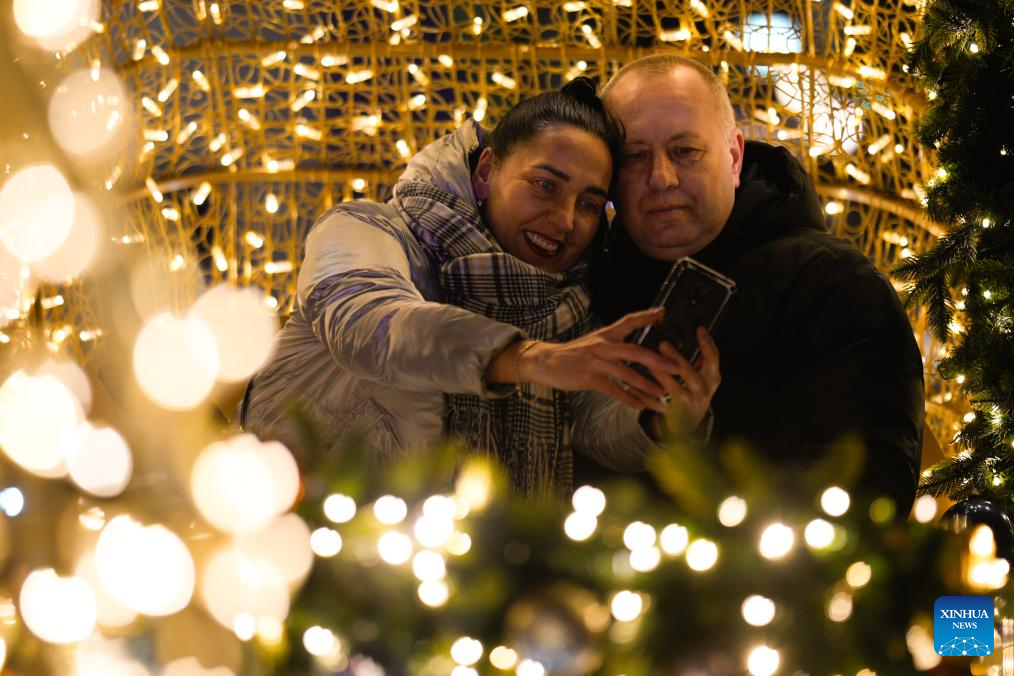 Visitors take a selfie in the Old Town in Warsaw, Poland, Dec. 3, 2025. Christmas decorations bring strong festive vibe to the city. (Photo by Jaap Arriens/Xinhua)