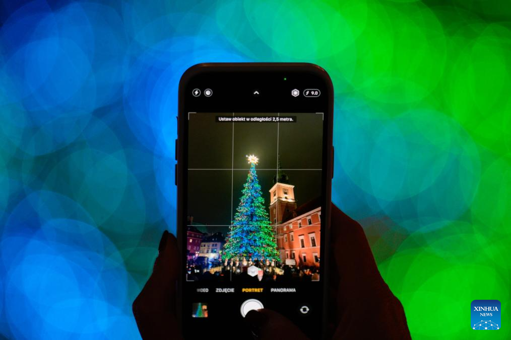 A Christmas tree is captured by a visitor on Castle Square, in Warsaw, Poland, Dec. 3, 2025. Christmas decorations bring strong festive vibe to the city. (Photo by Jaap Arriens/Xinhua)