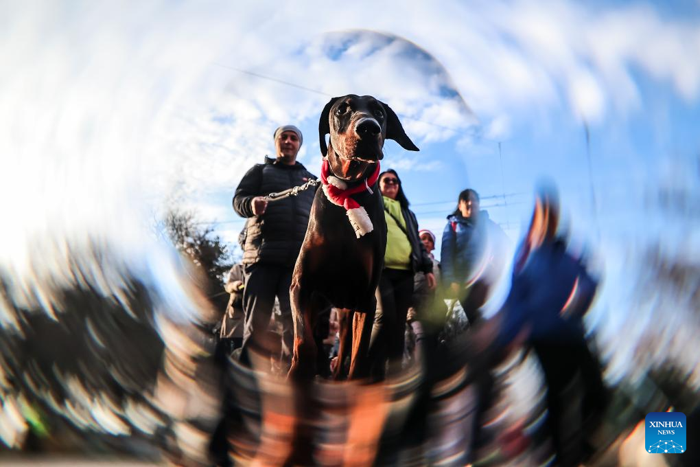 Participants walk with their dogs during an annual "Santa Dog Walk" event at the City Park in Budapest, Hungary on Dec. 6, 2025. The Christmas-themed event brings together dog owners from across the city for a seasonal walk, promoting responsible pet ownership and encouraging outdoor activities for families and their pets. (Photo by David Balogh/Xinhua)