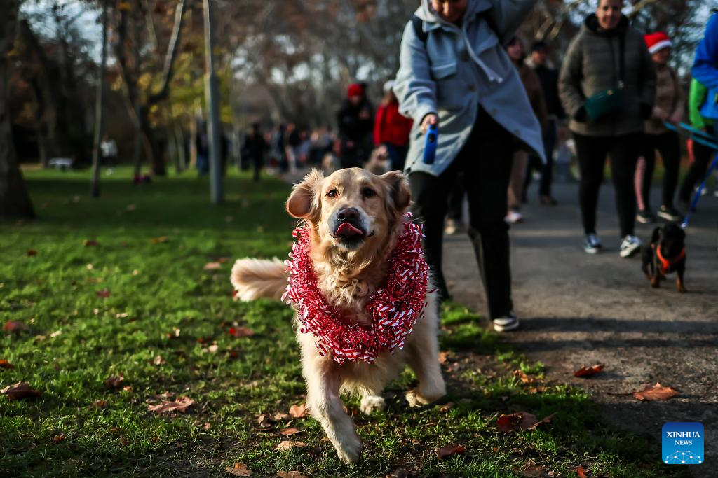 A dog participates in an annual "Santa Dog Walk" event in the City Park in Budapest, Hungary on Dec. 6, 2025. The Christmas-themed event brings together dog owners from across the city for a seasonal walk, promoting responsible pet ownership and encouraging outdoor activities for families and their pets. (Photo by David Balogh/Xinhua)