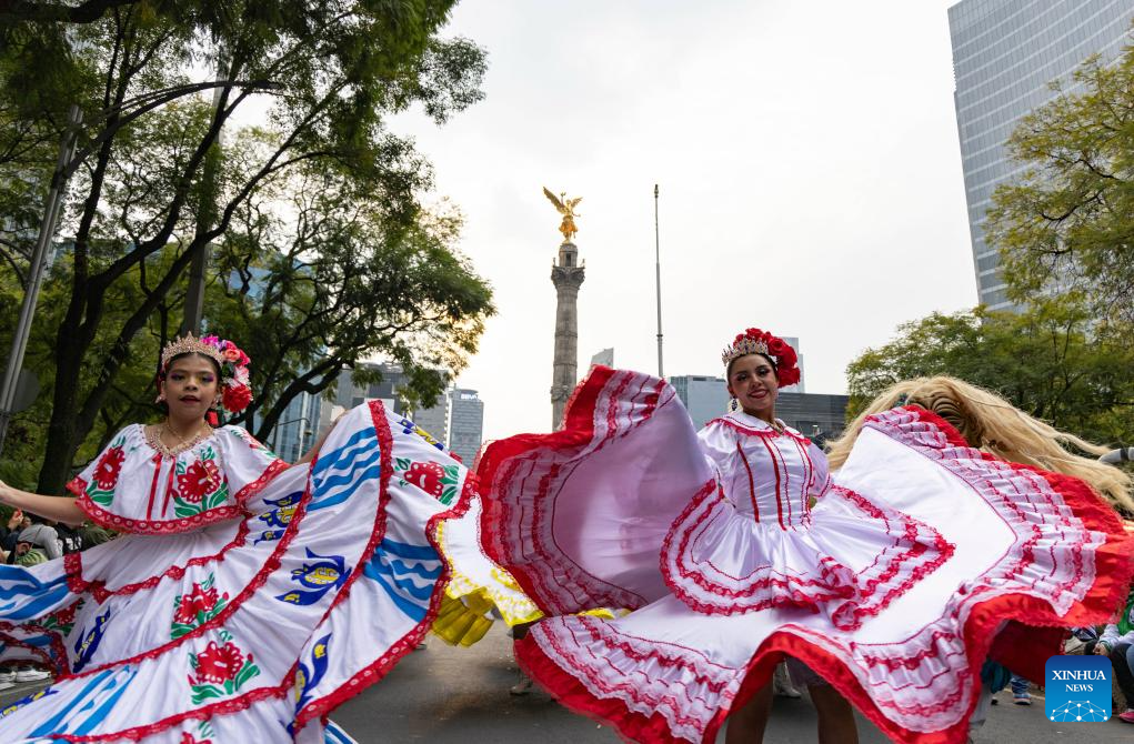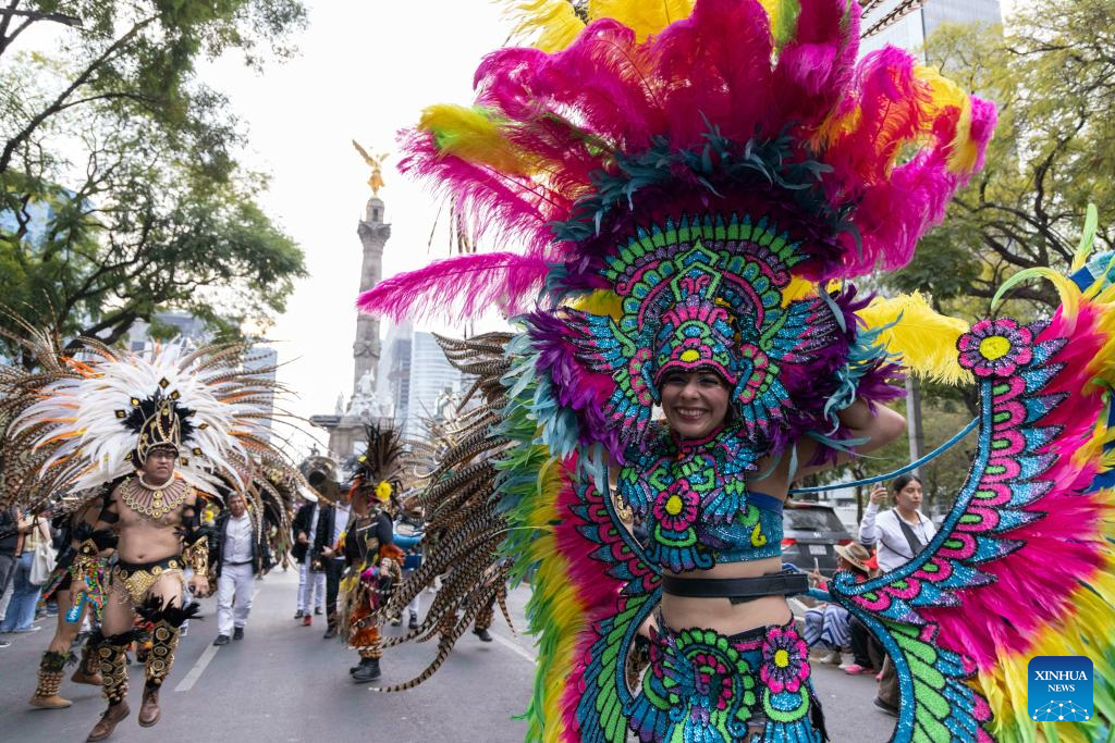 Costumed performers are pictured during the Villa-Zapata carnival in Mexico City, Mexico, on Dec. 6, 2025. The 11th Villa-Zapata carnival was hosted in Mexico City on Saturday. Folkloric dances, traditional music, and street processions were seen along the Paseo de la Reforma avenue during the event, promoting traditional Mexican culture while paying tribute to revolutionary leaders Emiliano Zapata and Francisco Villa in the Mexican Revolution of 1910-1920. (Xinhua/Li Mengxin)