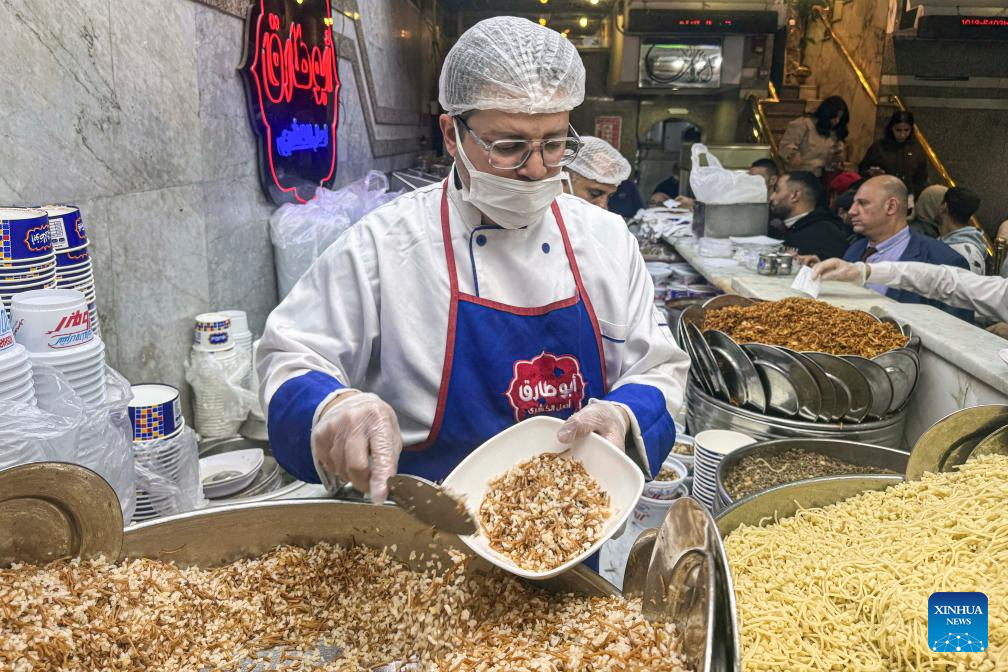 A waiter serves Koshary for customers at a restaurant in Cairo, Egypt, Dec. 10, 2025. Egypt's beloved national dish Koshary has been officially inscribed on the United Nations Educational, Scientific and Cultural Organization (UNESCO) Representative List of the Intangible Cultural Heritage of Humanity for 2025, the Egyptian Ministry of Culture said Wednesday in a statement. (Photo by Ahmed Gomaa/Xinhua)