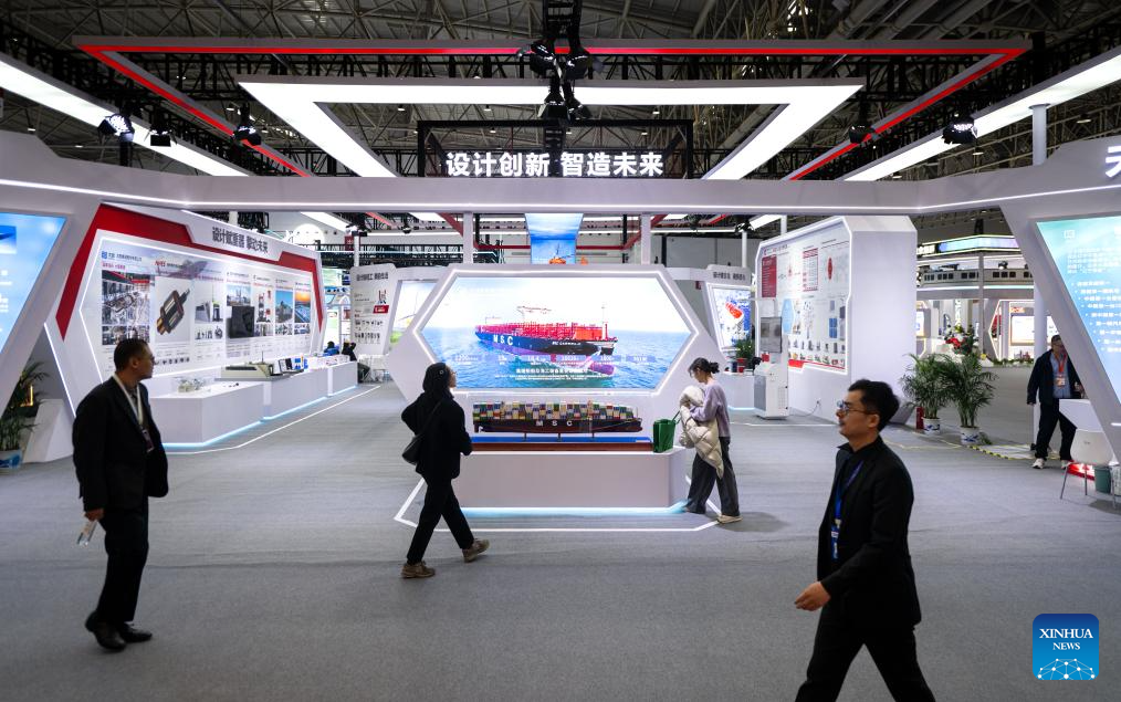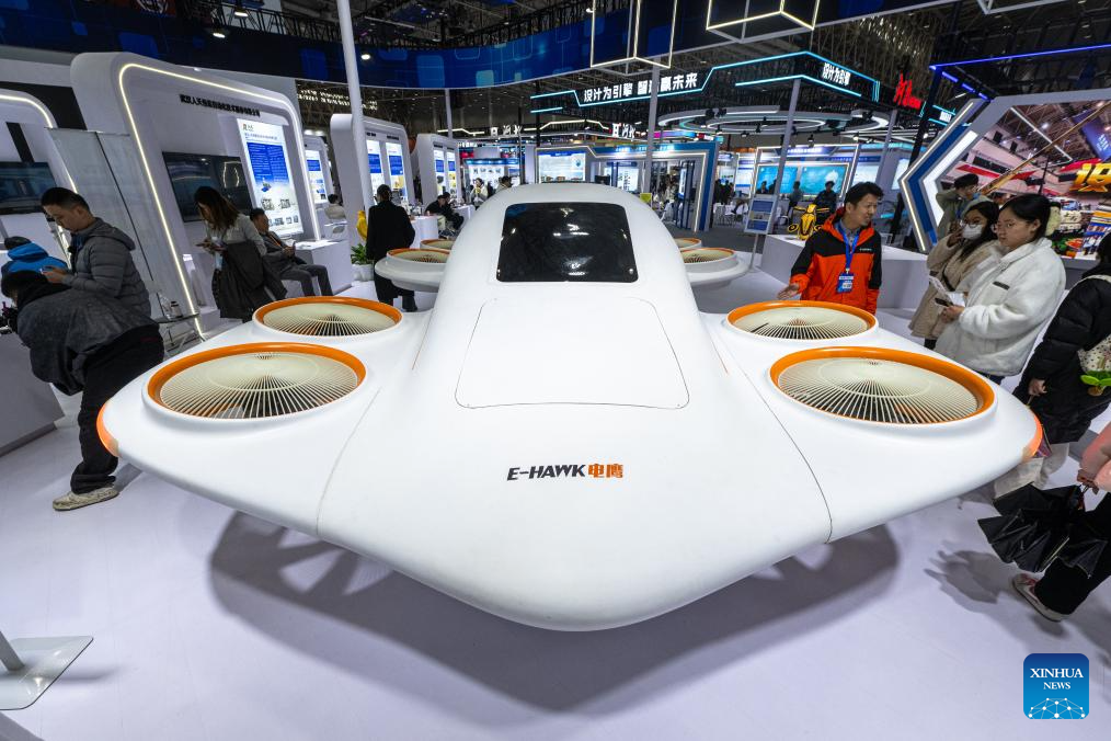 People view an exhibit at the 2025 Wuhan International Industrial Design Expo in Wuhan, central China's Hubei Province, Dec. 12, 2025. The expo kicked off here on Friday, featuring ten specialized exhibition areas including low-altitude economy, AI empowerment, and future industries. More than 100 enterprises participated in the exhibition. (Xinhua/Xiao Yijiu)