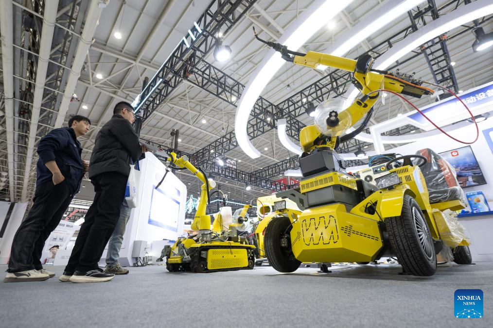 People learn about self-propelled welding robots at the 2025 Wuhan International Industrial Design Expo in Wuhan, central China's Hubei Province, Dec. 12, 2025. The expo kicked off here on Friday, featuring ten specialized exhibition areas including low-altitude economy, AI empowerment, and future industries. More than 100 enterprises participated in the exhibition. (Xinhua/Xiao Yijiu)