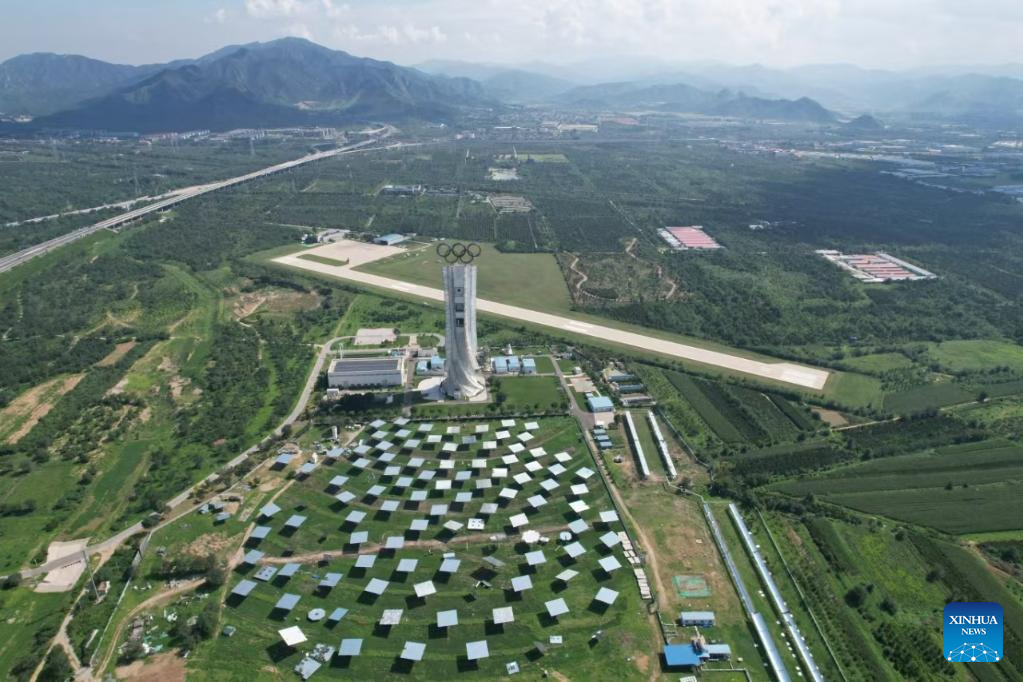 An aerial drone photo taken on July 12, 2024 shows an experimental solar thermal power station in Yanqing District of Beijing, capital of China. Wang Zhifeng, a solar thermal power researcher, led the construction of the power station. (Xinhua)