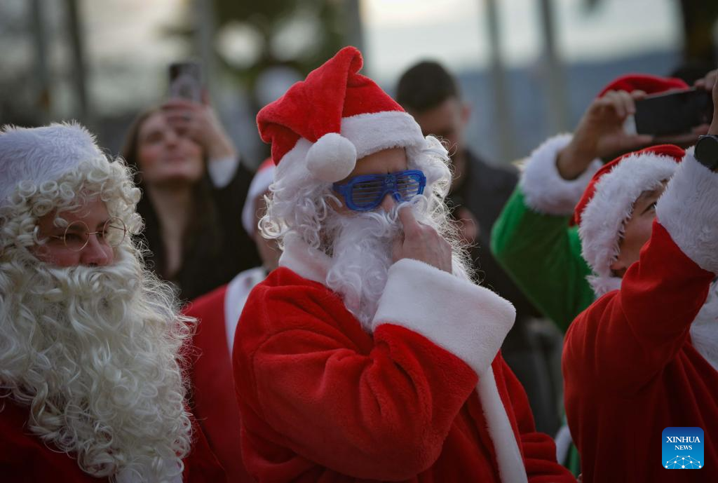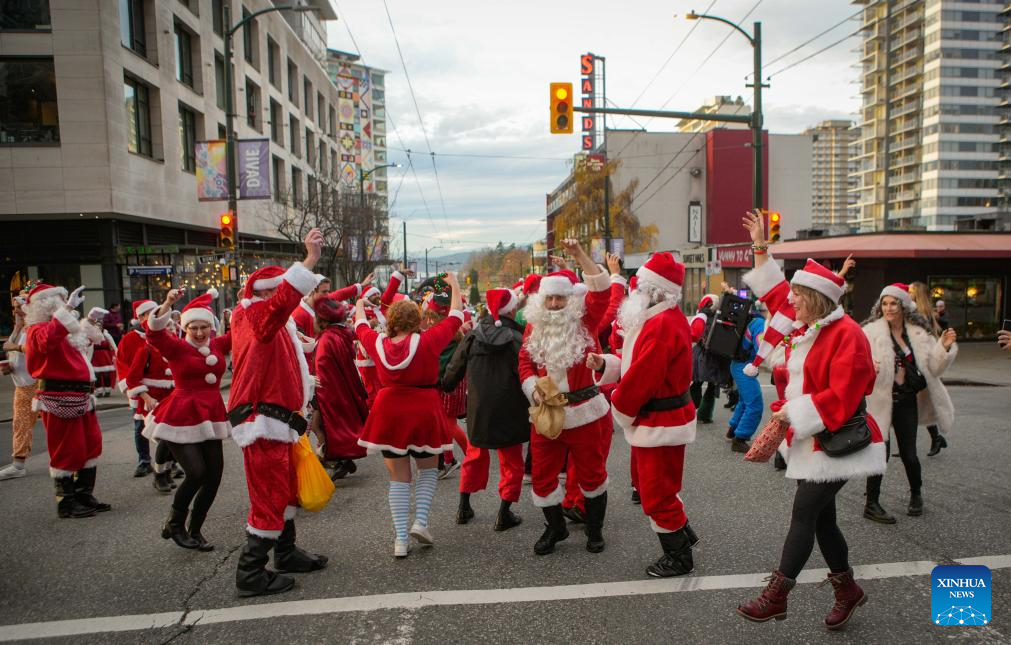 People dressed as Santa Claus attend the annual SantaCon event in Vancouver, Canada, Dec. 13, 2025. The annual event is held here on Saturday, with participants dressed as Santa Claus and other holiday characters moving at different locations and bringing a festive atmosphere and holiday cheer to the streets. (Photo by Liang Sen/Xinhua)