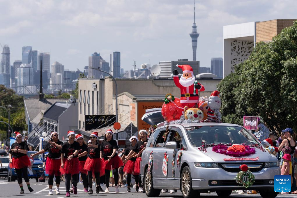 People attend a parade to celebrate the coming Christmas in Auckland, New Zealand, Dec. 14, 2025. (Photo by Wu Jiaxiang/Xinhua)