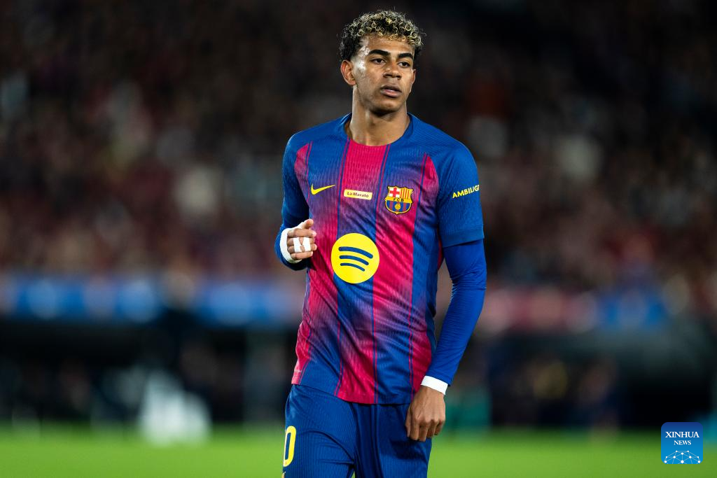 FC Barcelona's Lamine Yamal reacts during the Laliga football match between FC Barcelona and CA Osasuna in Barcelona, Spain, on Dec. 13, 2025. (Photo by Joan Gosa/Xinhua)