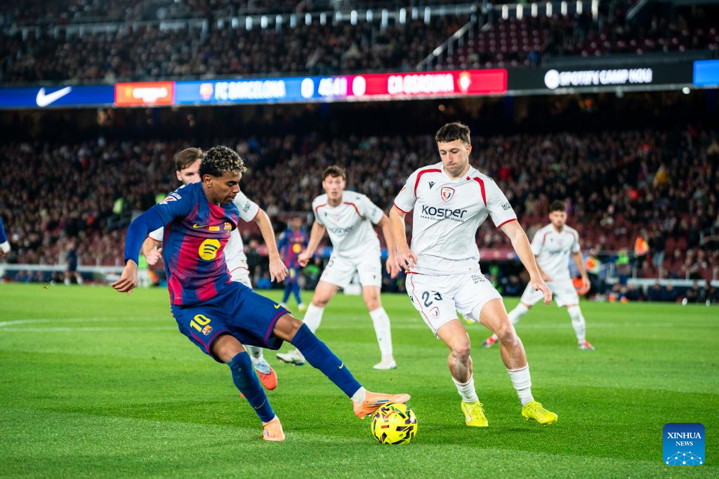 FC Barcelona's Lamine Yamal (1st L) vies with CA Osasuna's Abel Bretones (2nd R) during the Laliga football match between FC Barcelona and CA Osasuna in Barcelona, Spain, on Dec. 13, 2025. (Photo by Joan Gosa/Xinhua)