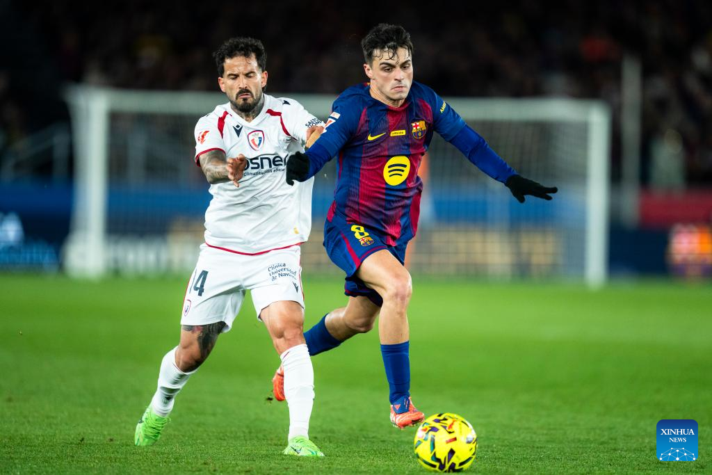 FC Barcelona's Pedri vies with CA Osasuna's Ruben Garcia during the Laliga football match between FC Barcelona and CA Osasuna in Barcelona, Spain, on Dec. 13, 2025. (Photo by Joan Gosa/Xinhua)