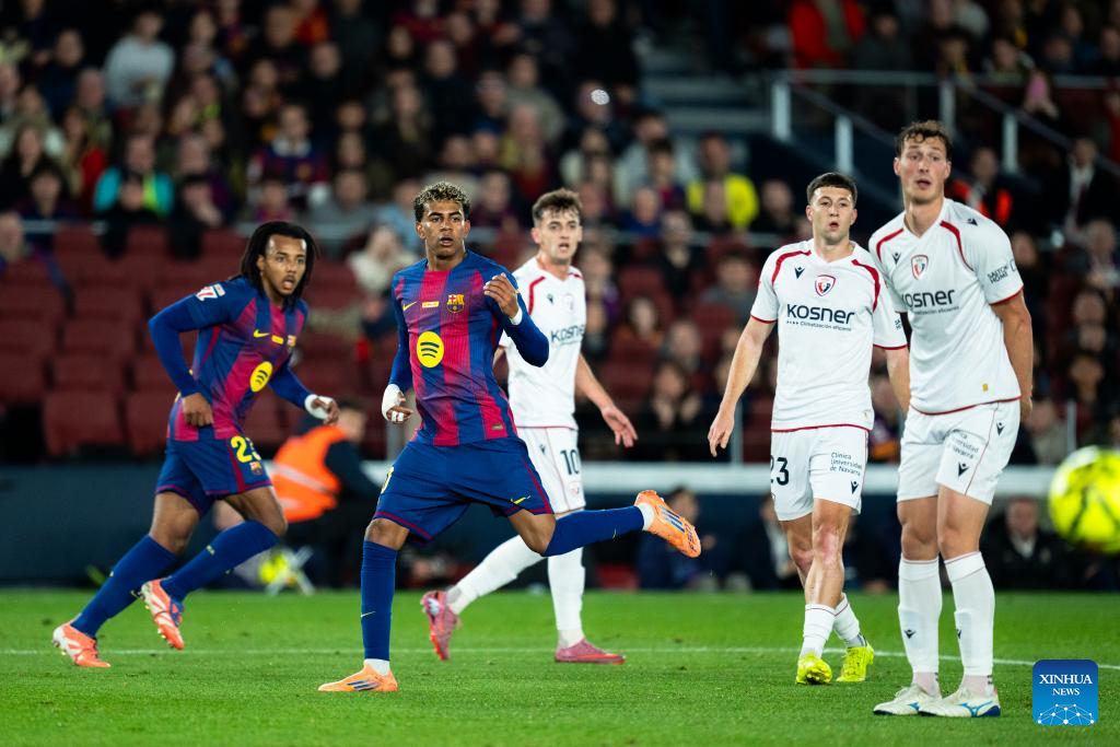 FC Barcelona's Lamine Yamal (2nd L) reacts after scoring chance during the Laliga football match between FC Barcelona and CA Osasuna in Barcelona, Spain, on Dec. 13, 2025. (Photo by Joan Gosa/Xinhua)
