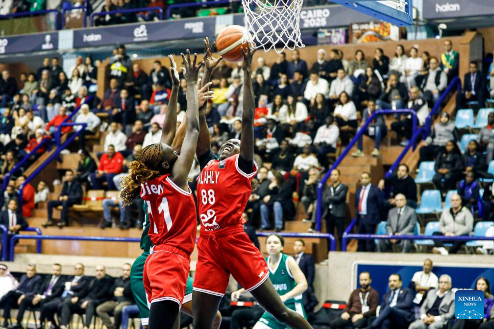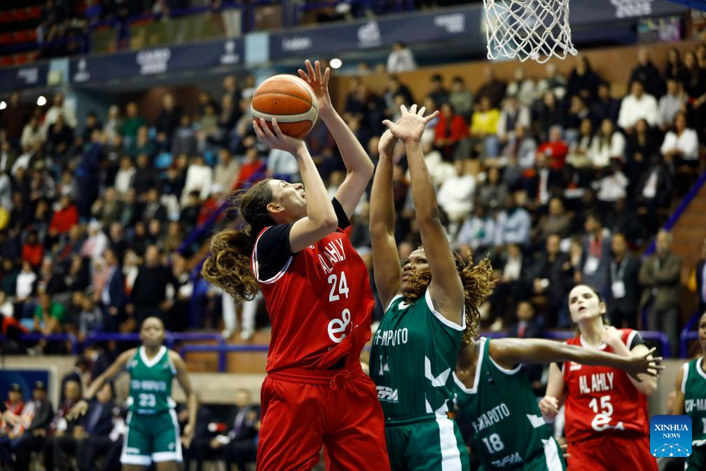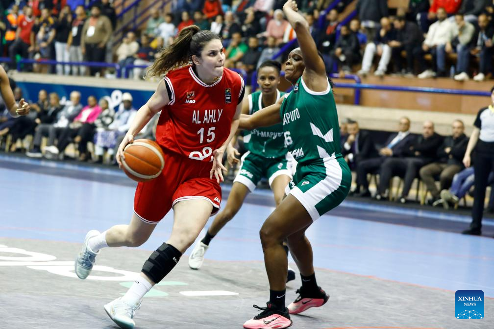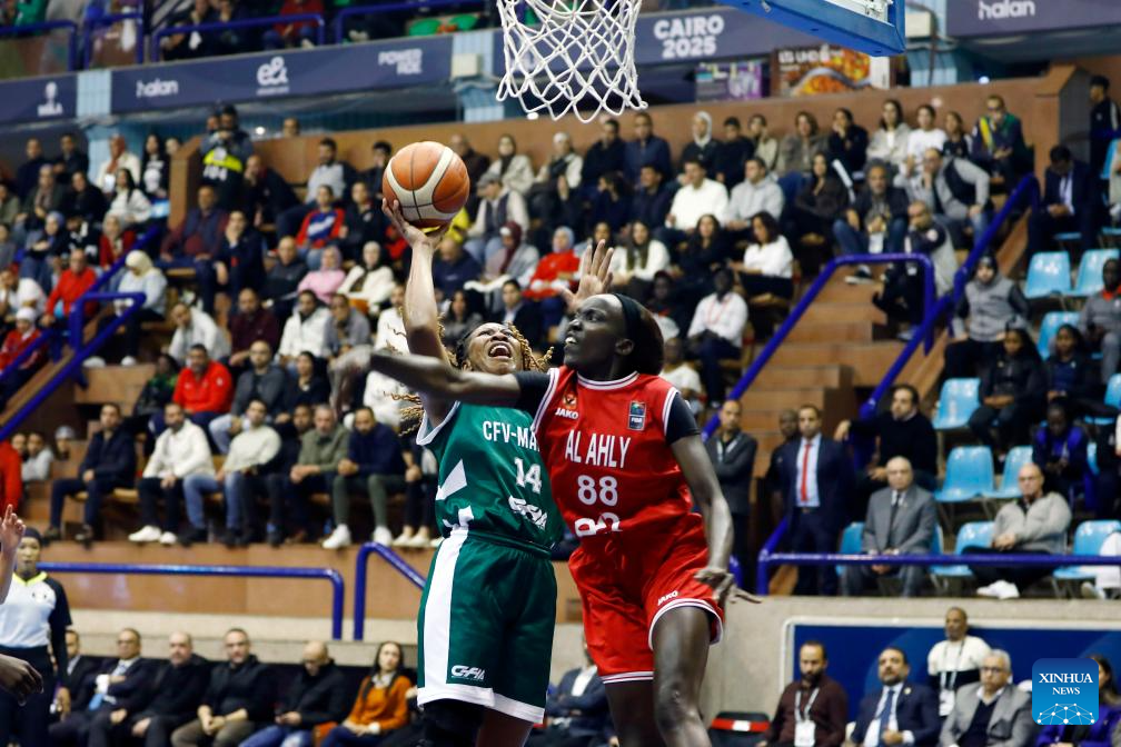 Hagar Amer (L) of Al Ahly Sporting Club competes during the FIBA Women's Basketball League Africa 2025 final match between Al Ahly Sporting Club of Egypt and Ferroviario Maputo of Mozambique in Cairo, Egypt, on Dec. 14, 2025. (Xinhua/Ahmed Gomaa)