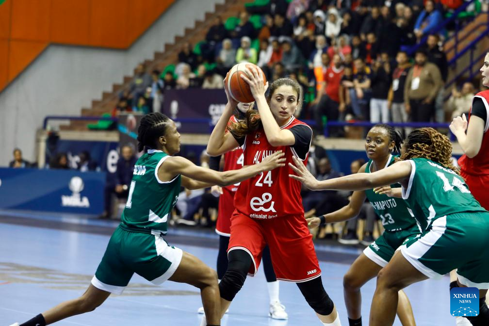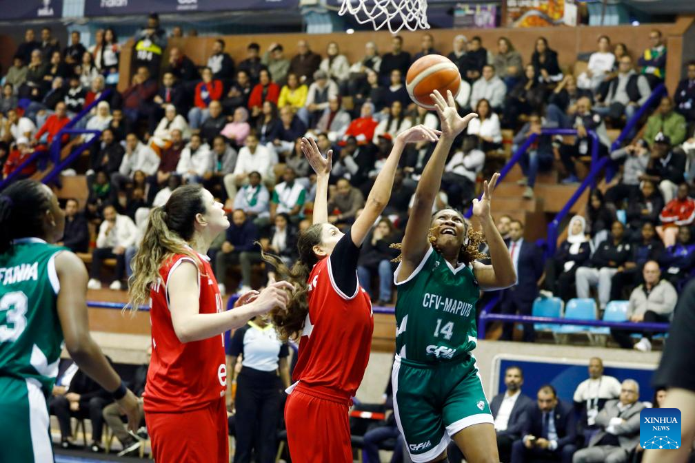 Odelia Mafanela (1st R) of Ferroviario Maputo competes during the FIBA Women's Basketball League Africa 2025 final match between Al Ahly Sporting Club of Egypt and Ferroviario Maputo of Mozambique in Cairo, Egypt, on Dec. 14, 2025. (Xinhua/Ahmed Gomaa)
