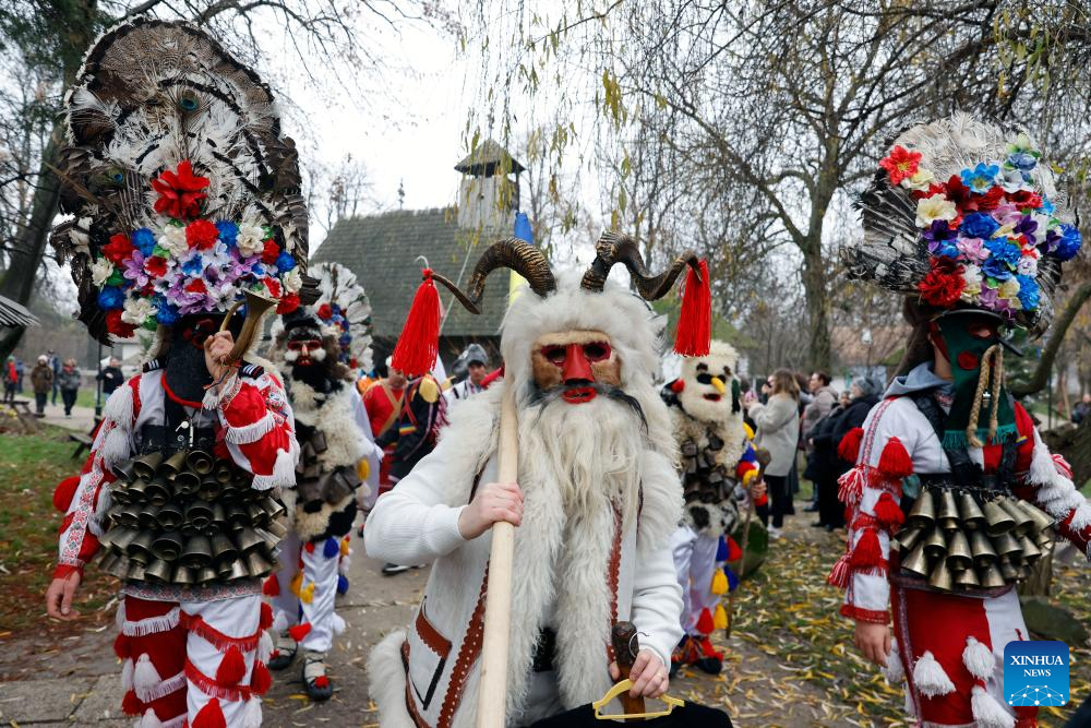Masked members of a traditional dance group perform during the "White Flowers" festival of traditions and customs at the Village Museum in Bucharest, Romania, on Dec. 14, 2025. (Photo by Cristian Cristel/Xinhua)