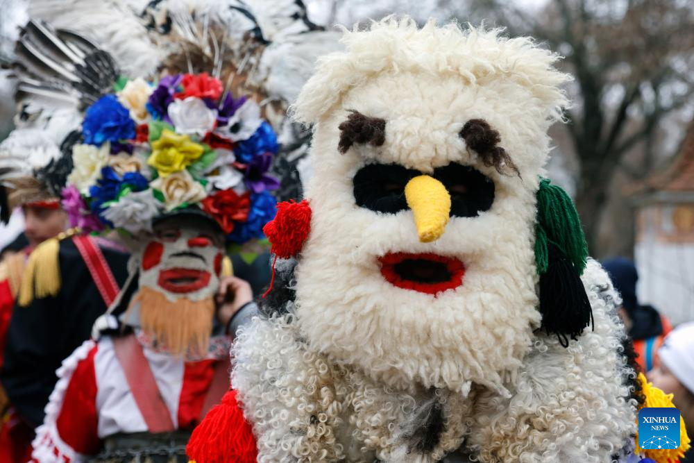 Masked members of a traditional dance group participate in a parade during the "White Flowers" festival of traditions and customs at the Village Museum in Bucharest, Romania, on Dec. 14, 2025. (Photo by Cristian Cristel/Xinhua)