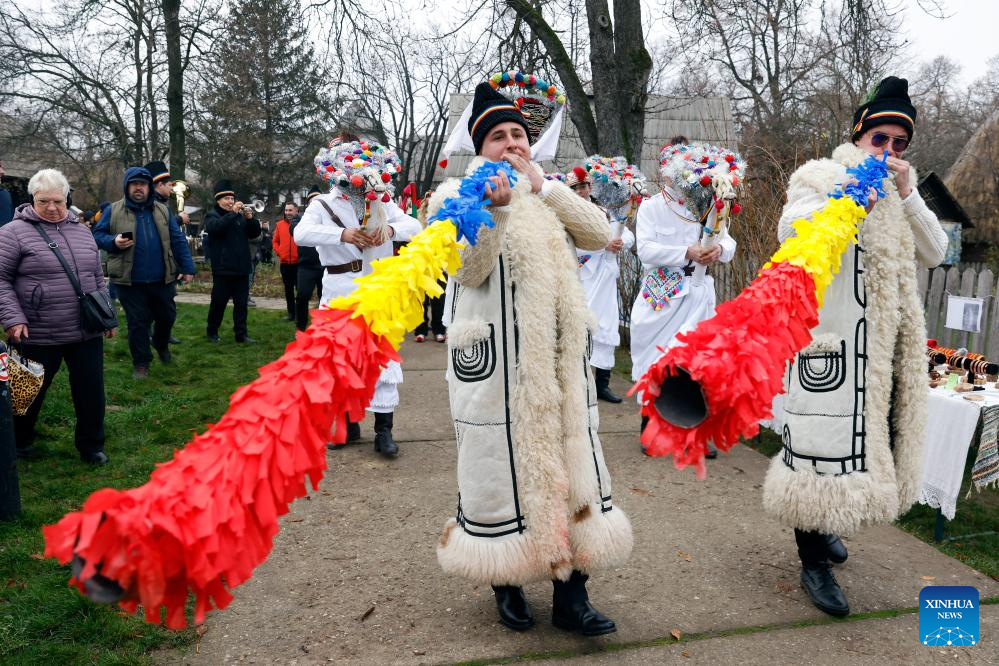 Members of a traditional dance group participate in a parade during the "White Flowers" festival of traditions and customs at the Village Museum in Bucharest, Romania, on Dec. 14, 2025. (Photo by Cristian Cristel/Xinhua)