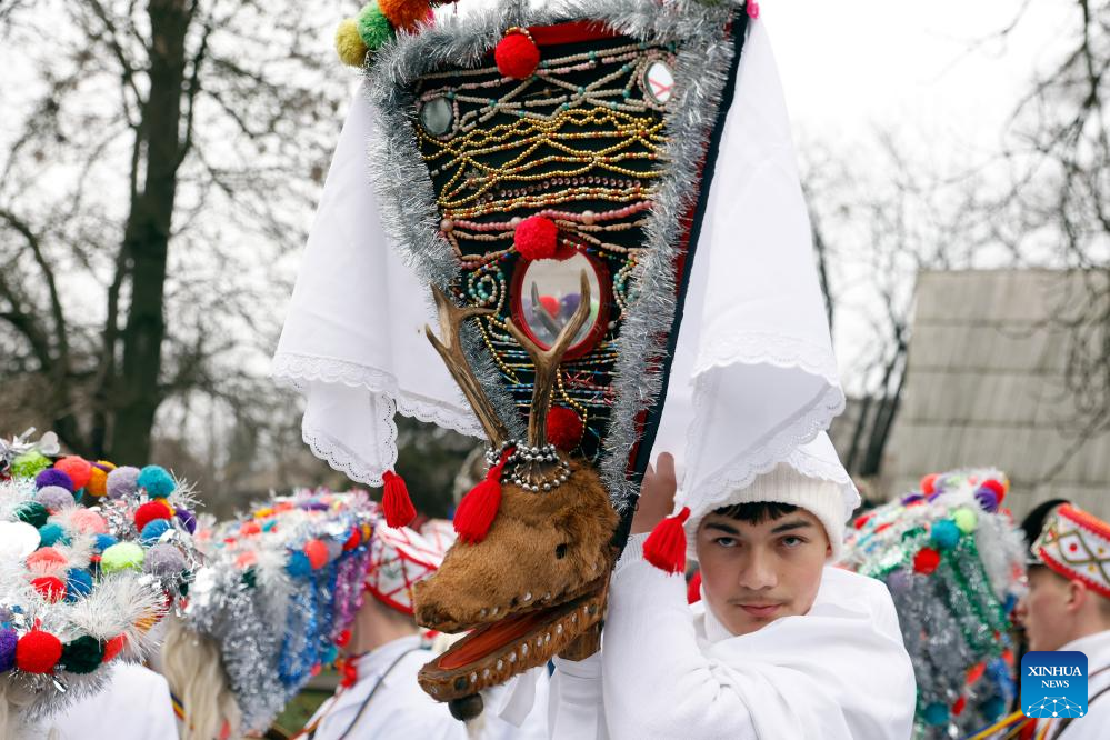 A member of a traditional dance group participates in a parade during the "White Flowers" festival of traditions and customs at the Village Museum in Bucharest, Romania, on Dec. 14, 2025. (Photo by Cristian Cristel/Xinhua)