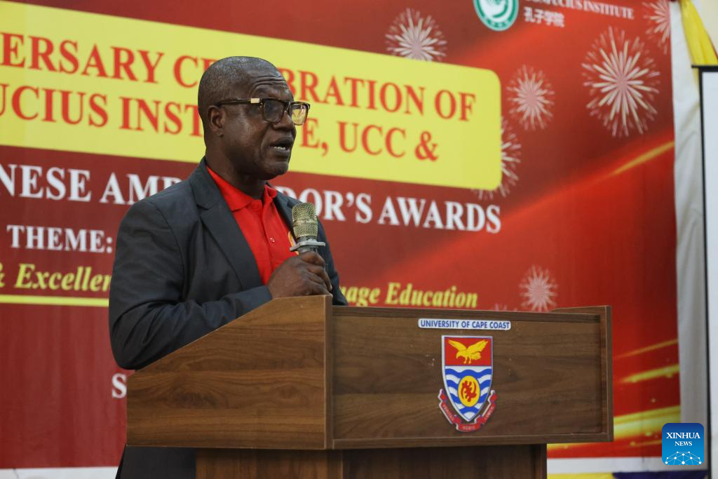 Vincent Assanful, chairman of the Governing Board of the National Council for Curriculum and Assessment (NaCCA), speaks at the 10th anniversary of the Confucius Institute at the University of Cape Coast (CIUCC) in Cape Coast, capital of Ghana's Central Region, Dec. 15, 2025. Ghana is set to formally introduce the study of the Chinese language into basic schools across the country in early 2026, Assanful said Monday. (Xinhua/Seth)