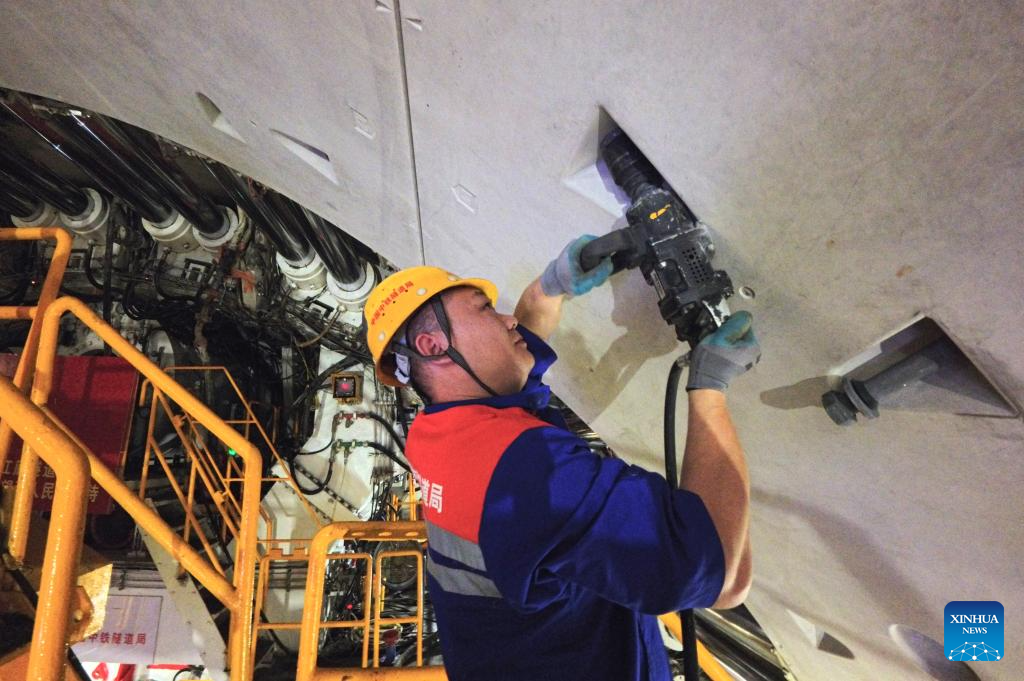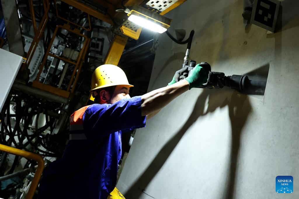 A worker screws a bolt tight at the construction site of the Chongming-Taicang tunnel, part of the Shanghai-Chongqing-Chengdu High-Speed Railway, under Yangtze River, on Dec. 16, 2025. The ongoing excavation of the tunnel under Yangtze River, carried out by the world's largest diameter high-speed rail shield tunneling machine the "Linghang" that is independently developed by China, has exceeded the 10,000-meter mark on Tuesday, which laid a solid foundation for the completion of the tunnel.