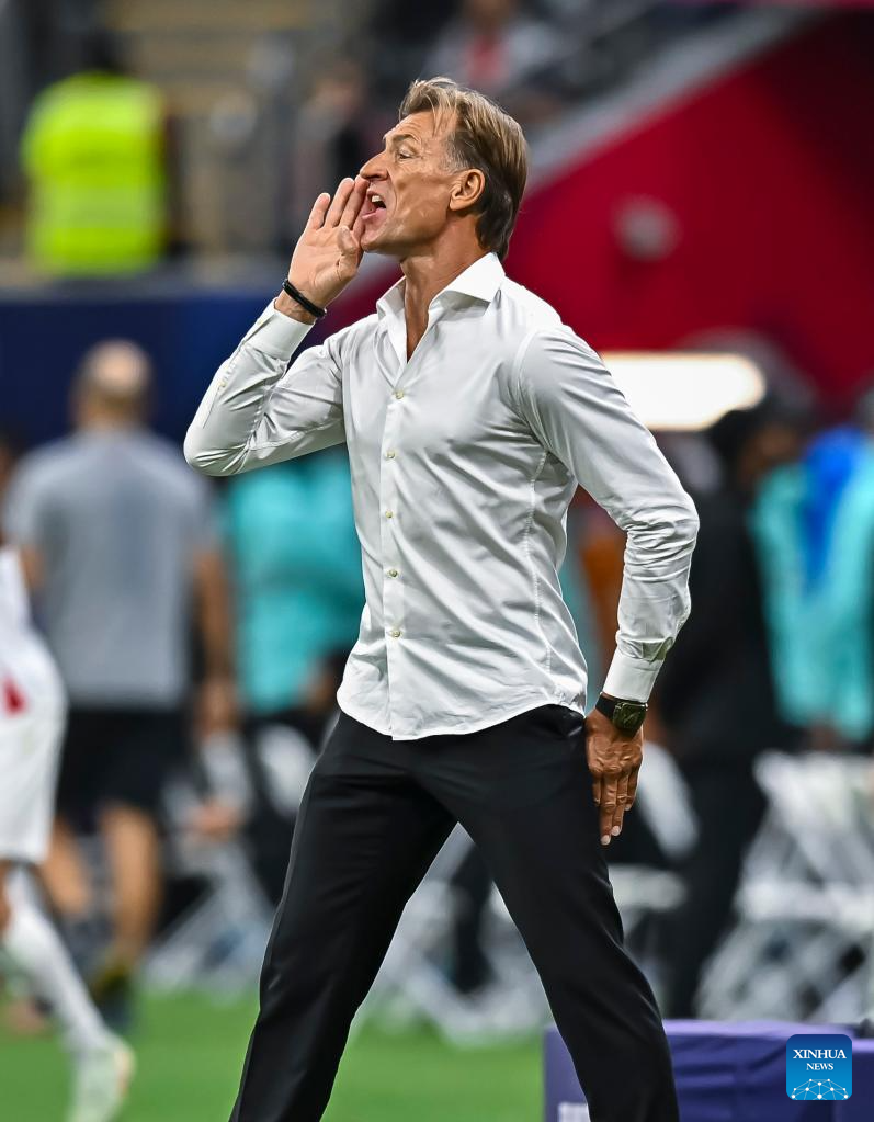 Herve Renard, head coach of Saudi Arabia, reacts during the FIFA Arab Cup 2025 Semi-final match between Saudi Arabia and Jordan at Al Bayt Stadium in Al Khor, Qatar, on Dec. 15, 2025. (Photo by Nikku/Xinhua)