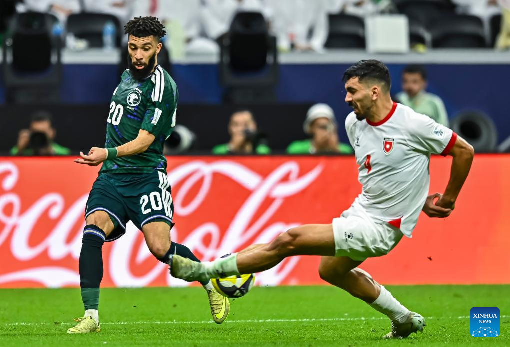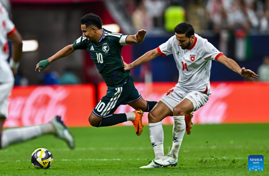 Hassan Altambakti (R) of Saudi Arabia vies with Mahmoud Almardi (C) of Jordan during the FIFA Arab Cup 2025 Semi-final match between Saudi Arabia and Jordan at Al Bayt Stadium in Al Khor, Qatar, on Dec. 15, 2025. (Photo by Nikku/Xinhua)