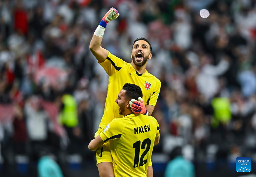 Players of Jordan celebrate after winning the FIFA Arab Cup 2025 Semi-final match between Saudi Arabia and Jordan at Al Bayt Stadium in Al Khor, Qatar, on Dec. 15, 2025. (Photo by Nikku/Xinhua)