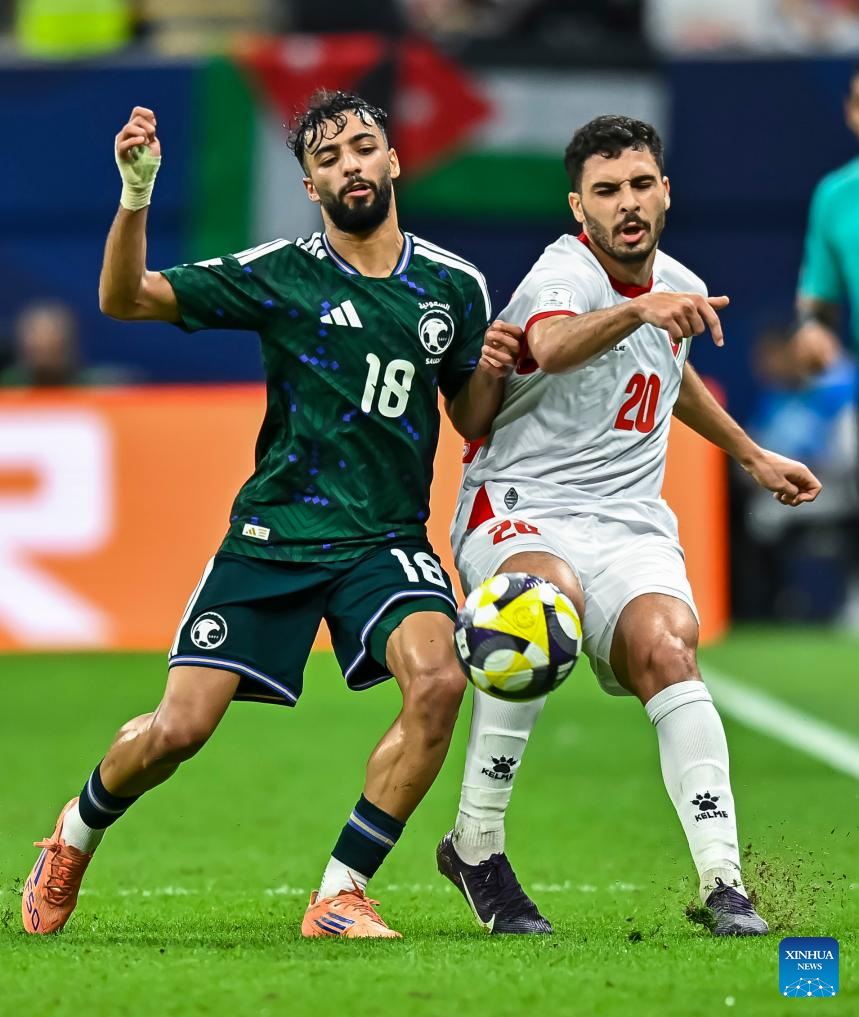 Waleed Alahmad (3rd R) of Saudi Arabia vies with Abdallah Nasib (2nd R) of Jordan during the FIFA Arab Cup 2025 Semi-final match between Saudi Arabia and Jordan at Al Bayt Stadium in Al Khor, Qatar, on Dec. 15, 2025. (Photo by Nikku/Xinhua)
