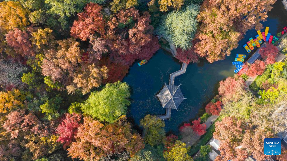 An aerial drone photo taken on Nov. 28, 2025 shows tourists visiting Yushan national forest park in Changshu City, east China's Jiangsu Province. (Photo by Wang Xuzhong/Xinhua)