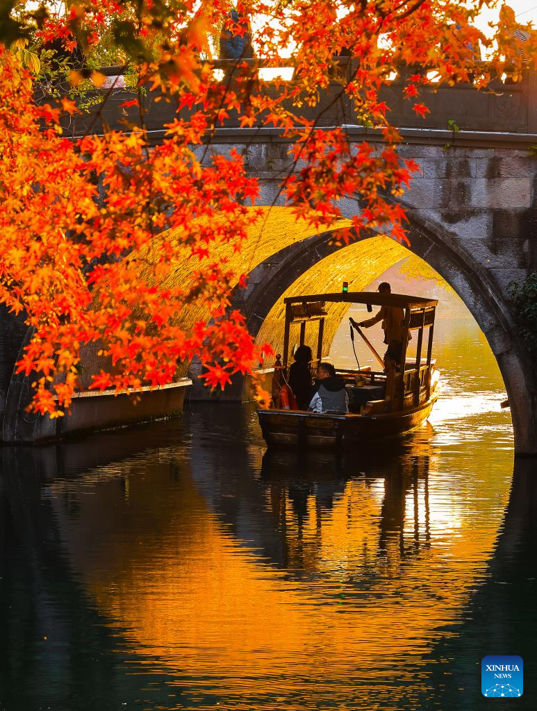 An aerial drone photo taken on Nov. 23, 2025 shows tourists enjoying sightseeing on an arch bridge near Wenchang pavilion in Ningbo City, east China's Zhejiang Province. (Photo by Hu Xuejun/Xinhua)