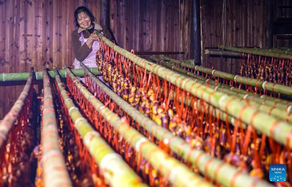 A villager makes sausages in Dawan Village, Tongren City of southwest China's Guizhou Province, Dec. 15, 2025. (Photo by Hu Panxue/Xinhua)