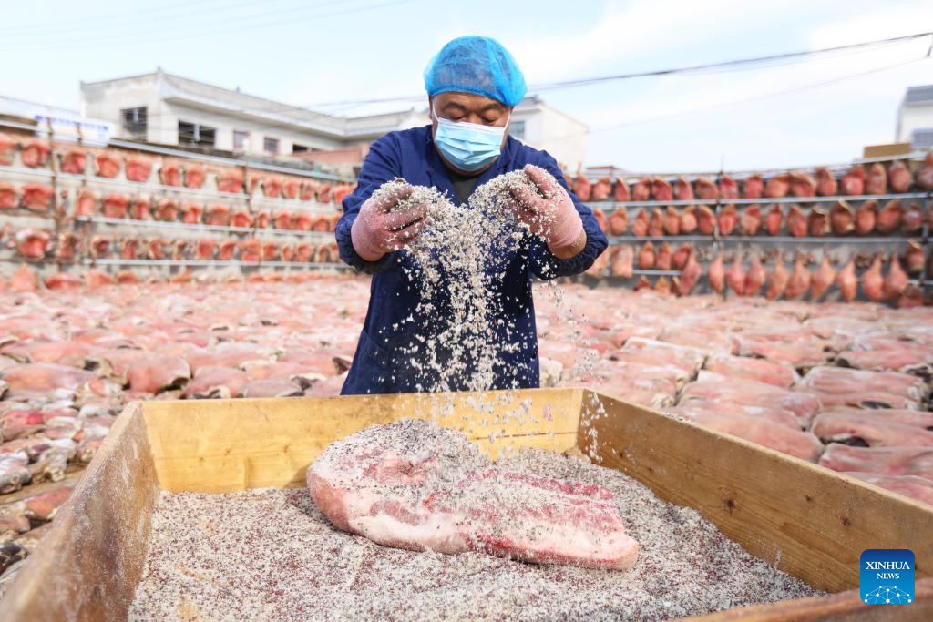 A man makes cured meat in Longxi County, Dingxi City of northwest China's Gansu Province, Dec. 8, 2025. (Photo by Wang Kexian/Xinhua)