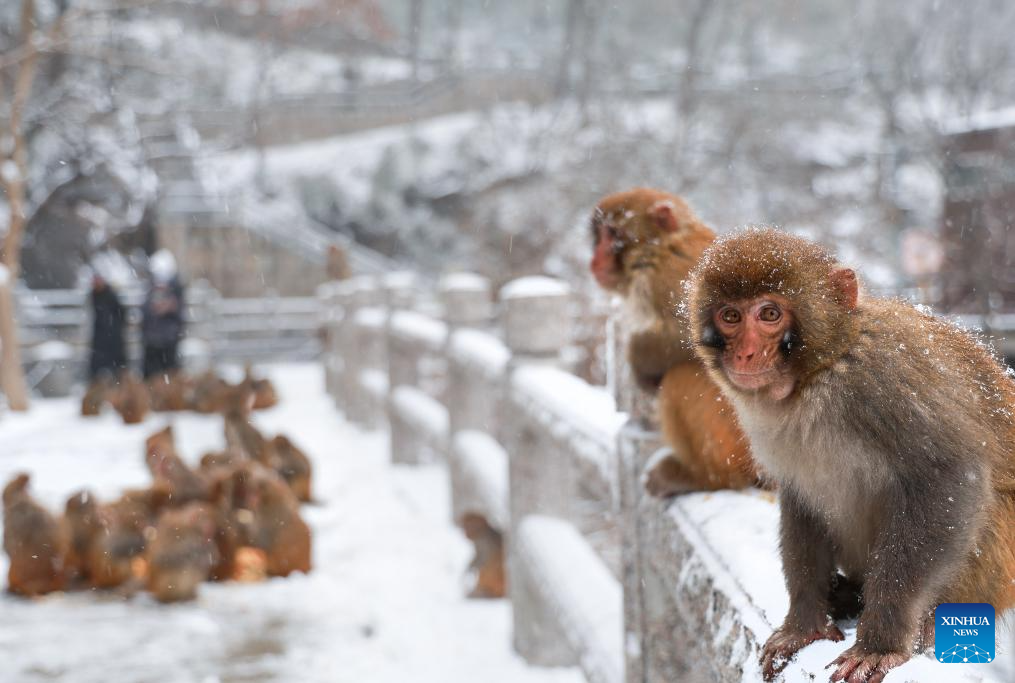 Monkeys rest on a rail at Huaguo mountain scenic spot after snowfall in Lianyungang City, east China's Jiangsu Province, Dec. 13, 2025. (Photo by Wang Jianmin/Xinhua)