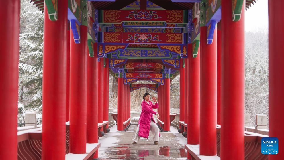 A Tai Chi enthusiast exercises at a corridor of Yinghua mountain scenic spot in Zouping City, east China's Shandong Province, Dec. 13, 2025. (Photo by Dong Naide/Xinhua)