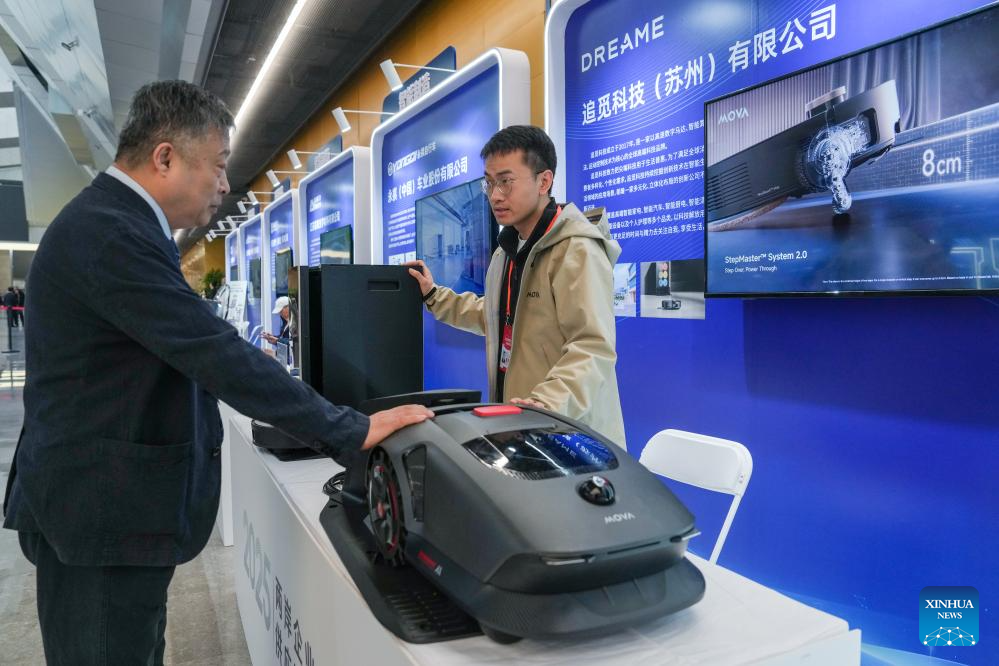 A participant visits an exhibition area of the 2025 annual conference of the Cross-Strait CEO Summit in Nanjing, east China's Jiangsu Province, Dec. 16, 2025. The 2025 annual conference of the Cross-Strait CEO Summit opened here Tuesday. About 800 people from the Chinese mainland and Taiwan gathered on Tuesday in Nanjing to discuss cross-Strait industrial transformation, innovation and cooperation. (Xinhua/Li Bo)