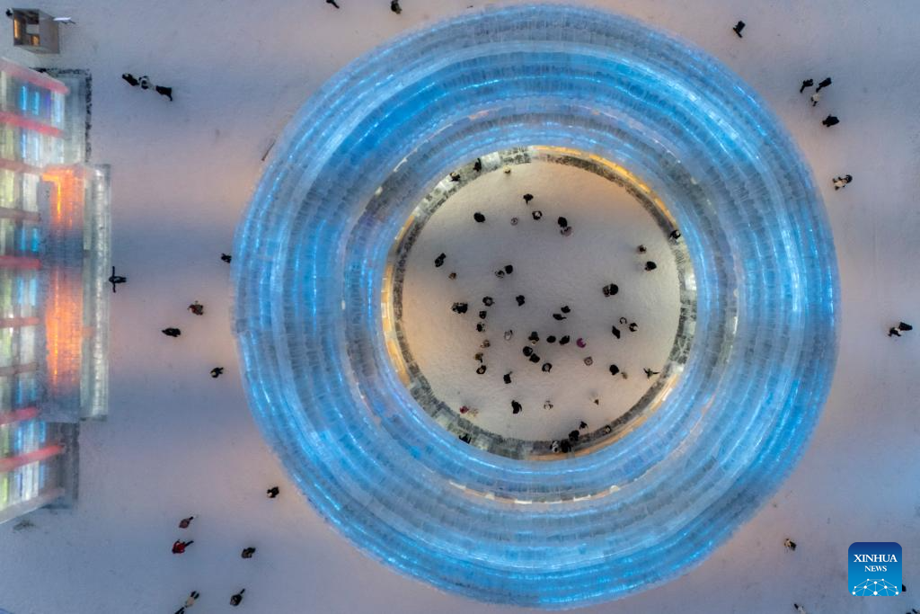 An aerial drone photo taken on Dec. 17, 2025 shows tourists visiting the Harbin Ice-Snow World in Harbin, northeast China's Heilongjiang Province. The Harbin Ice-Snow World, world's largest ice and snow theme park, officially opened for the season on Wednesday, unveiling its most spectacular edition yet, featuring landmark attractions, thoughtful services and magnificent ice sculptures across a record 1.2 million square meters of park area. (Xinhua/Xie Jianfei)