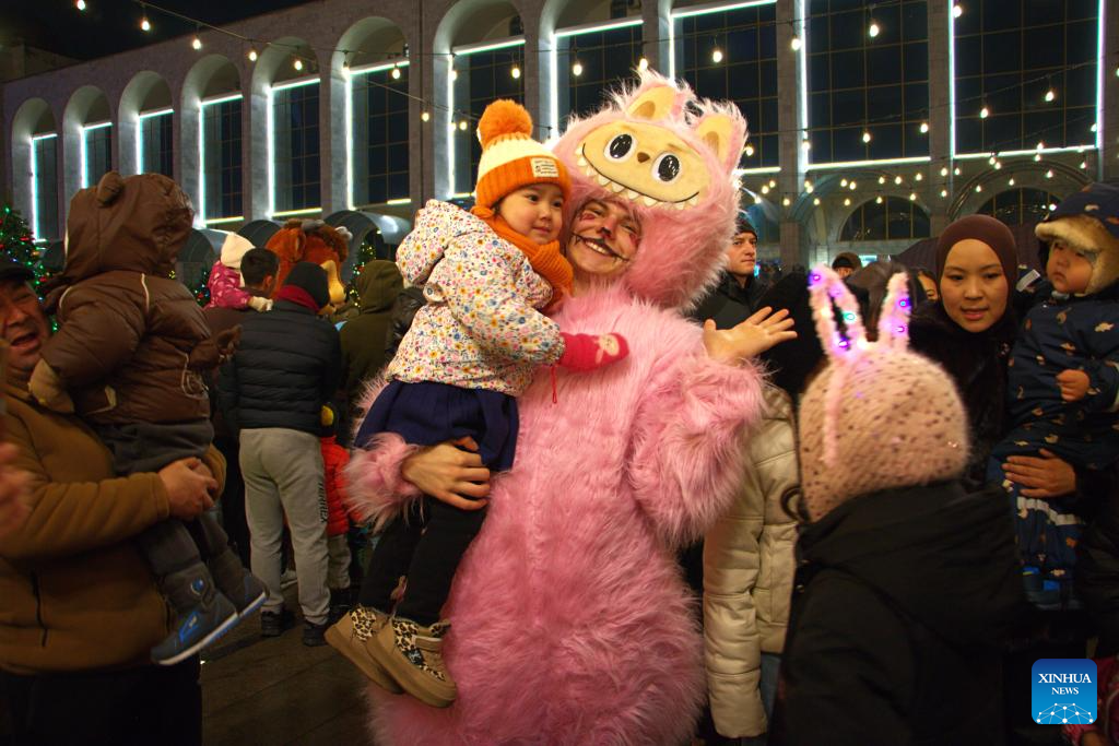 People interact with a Labubu mascot, a popular furry doll from Chinese toy company Pop Mart, during the New Year tree lighting ceremony in Bishkek, Kyrgyzstan, Dec. 15, 2025. (Photo by Liu Xiaowan/Xinhua)