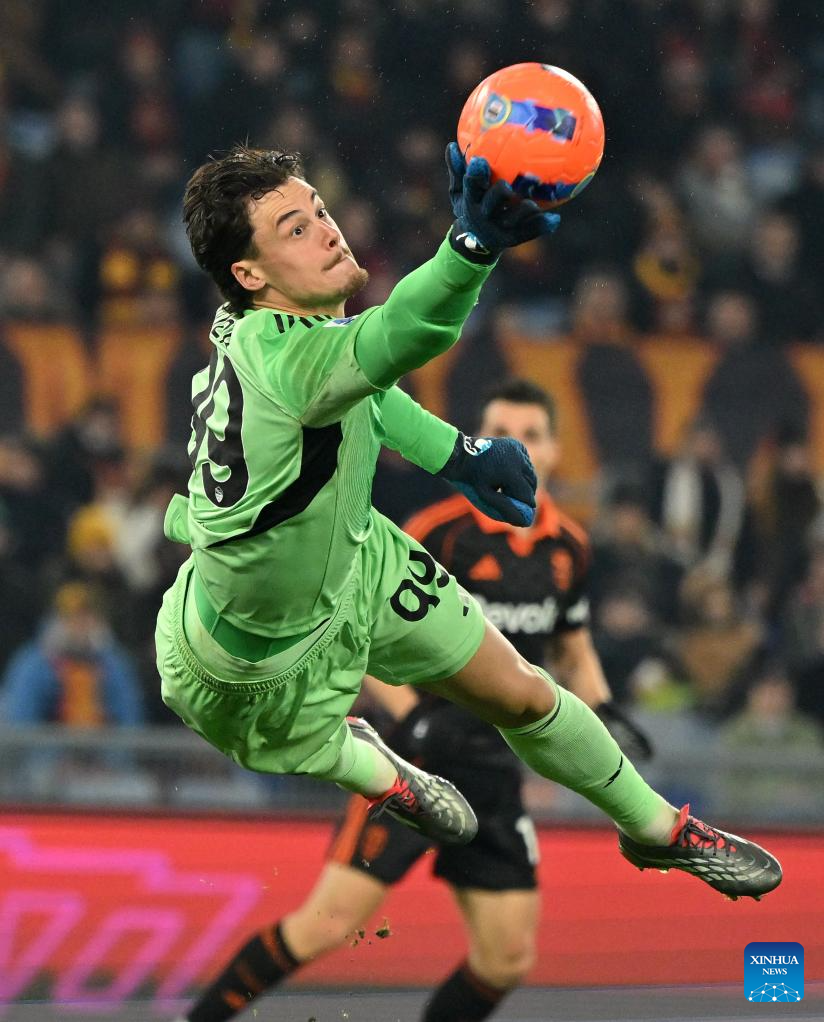 Roma's goalkeeper Mile Svilar makes a save during a Serie A football match between Roma and Como in Rome, Italy, Dec. 15, 2025. (Photo by Alberto Lingria/Xinhua)