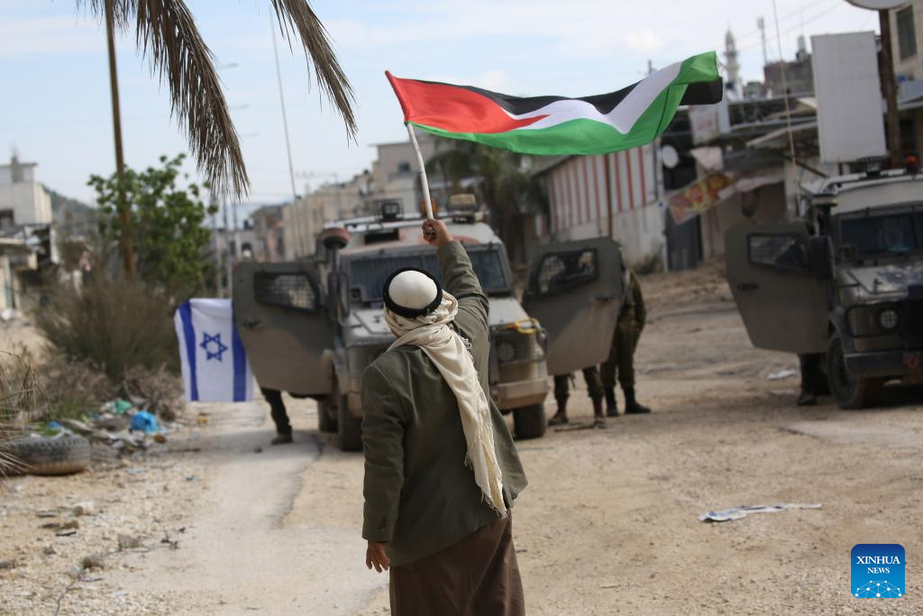 A Palestinian protests as the Israeli army blocks the street at the main entrance of Nur Shams camp, east of Tulkarm city in the West Bank, on Dec. 15, 2025. (Photo by Nidal Eshtayeh/Xinhua)