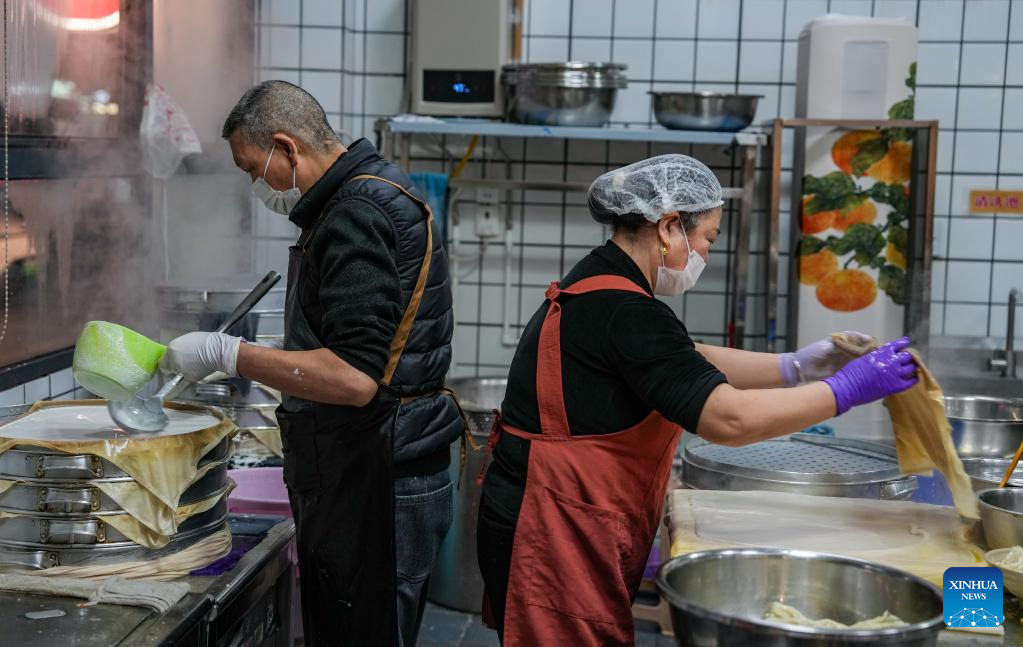Chefs prepare cold noodles at a restaurant in Guangyuan City, southwest China's Sichuan Province, Dec. 12, 2025. (Xinhua/Huang Wei)