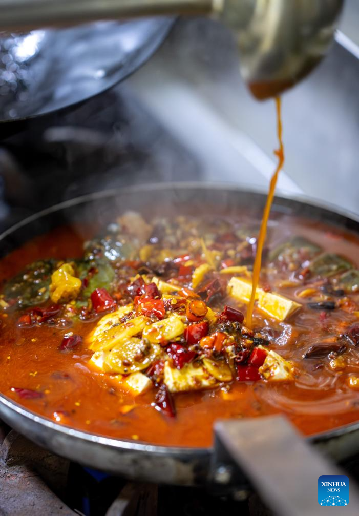 Chef Deng Yongbo, an inheritor of the Jianmen tofu intangible cultural heritage, prepares tofu dishes at a restaurant in Jian'ge County of Guangyuan City, southwest China's Sichuan Province, Dec. 13, 2025. (Xinhua/Zhang Xiaoyu)