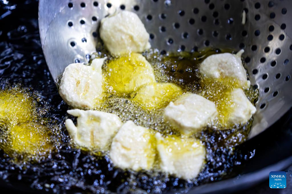 This photo taken on Dec. 13, 2025 shows the fried Jianmen tofu for a tofu banquet at a restaurant in Jian'ge County of Guangyuan City, southwest China's Sichuan Province. (Xinhua/Lian Zhen)