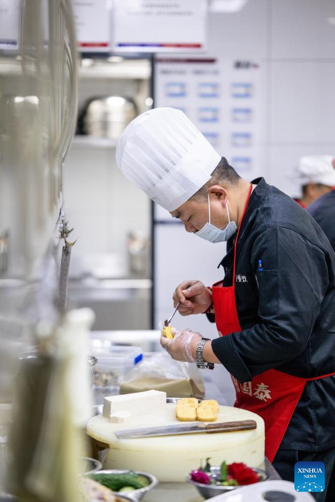 A chef prepares tofu banquet at a restaurant in Jian'ge County of Guangyuan City, southwest China's Sichuan Province, Dec. 13, 2025.